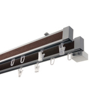 Prostokątne karnisze apartamentowe z paskiem drewna posiadają profile w kolorze chrom mat o wymiarach 13,8 mm x 34,0 mm.  Zarówno profile,  jak i pozostałe elementy wykonane są z wysokiej klasy anodowanego aluminium. Tak starannie wykończona i zabezpieczona powierzchnia gwarantuje, że produkt nie zmieni koloru co najmniej przez kilkanaście lat użytkowania. Tą samą technologią wykonywane są profile aluminiowe do kabin prysznicowych oraz frontowe panele do wysokiej klasy sprzętu Hi-Fi. Dla uatrakcyjnienia wyglądu i dodania przytulności karnisz ozdobiony jest cienkim paskiem naturalnego drewna.